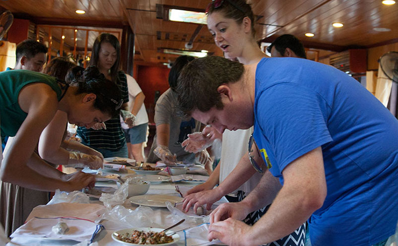 13.30: Delicious Vietnamese set menu while leisurely cruising to the core of Bai Tu Long Bay.